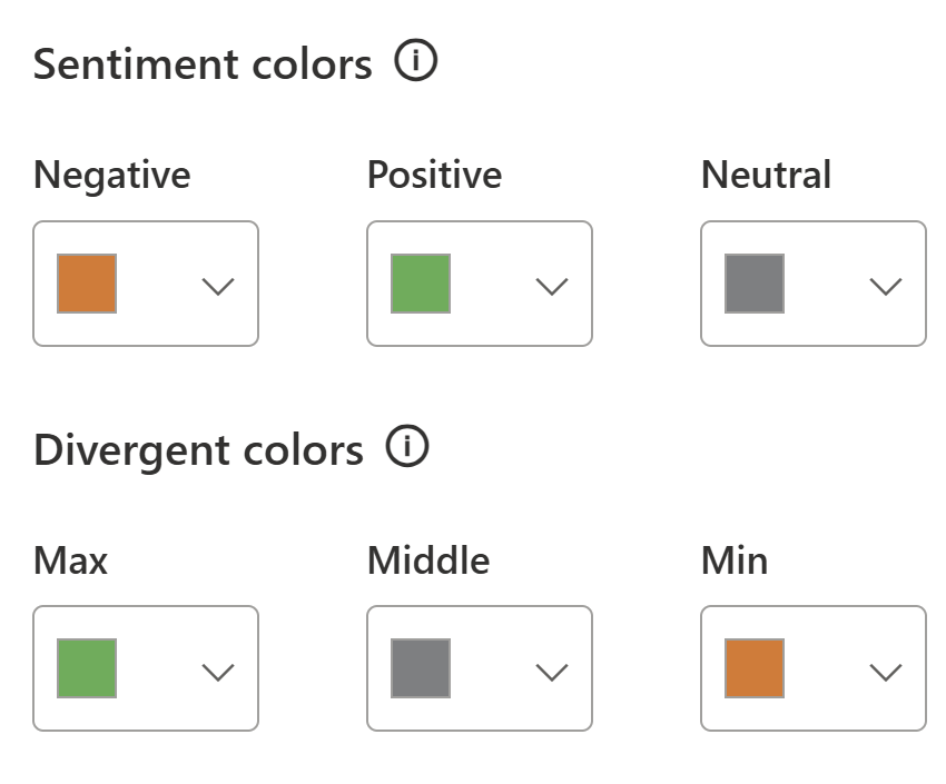Power BI allows you to define sentiment colors (positive, negative, neutral) and divergent colors (for variance scales). For example: