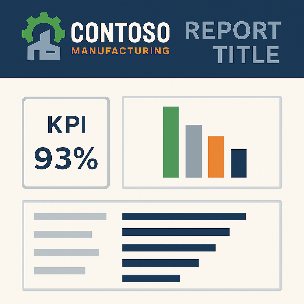 - Using the approved color palette (e.g., Contoso Manufacturing’s steel blue, machine green, and safety orange).